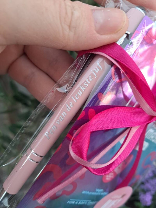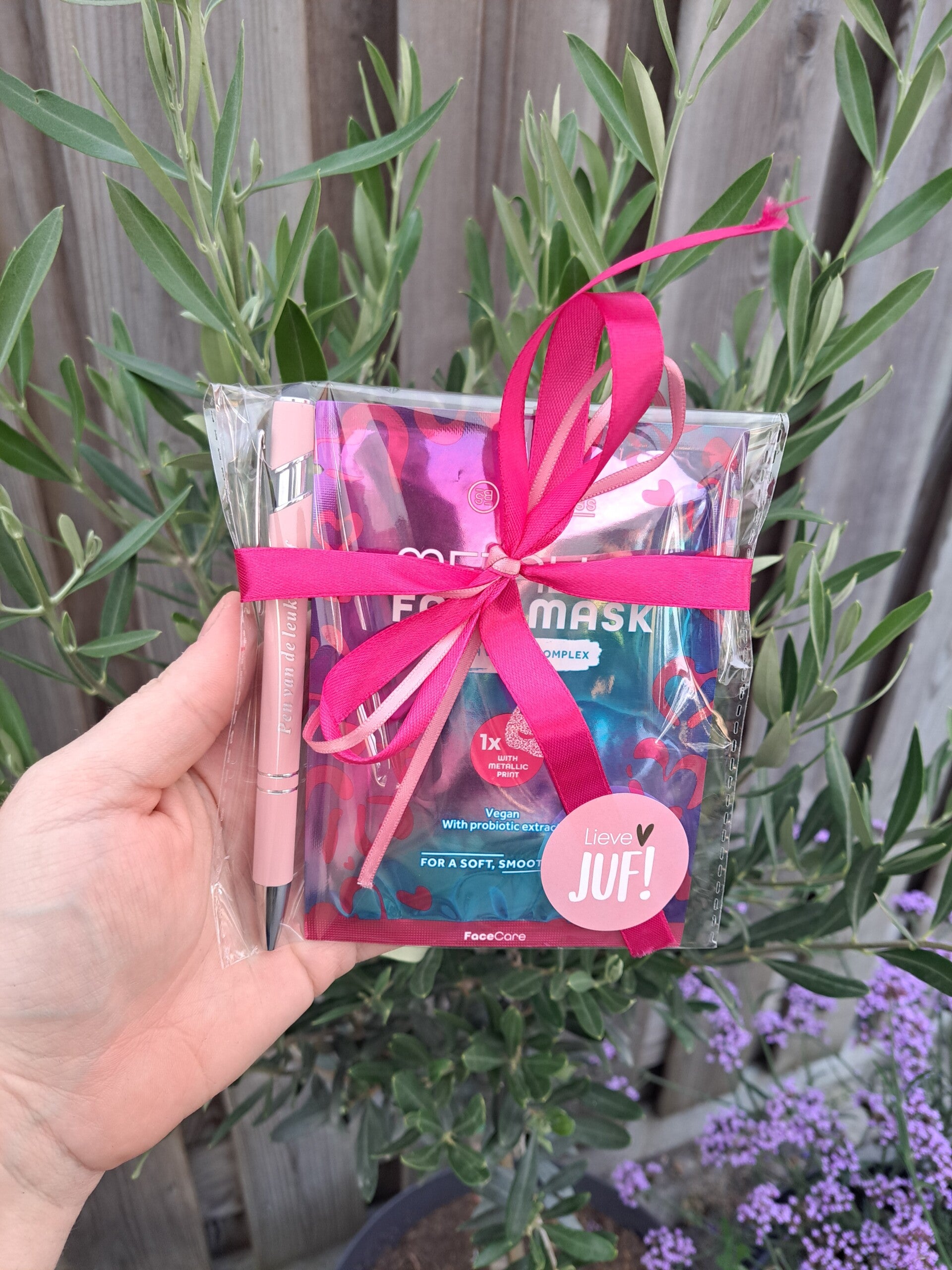 De masker en de pen worden leuk verpakt als een cadeautje.